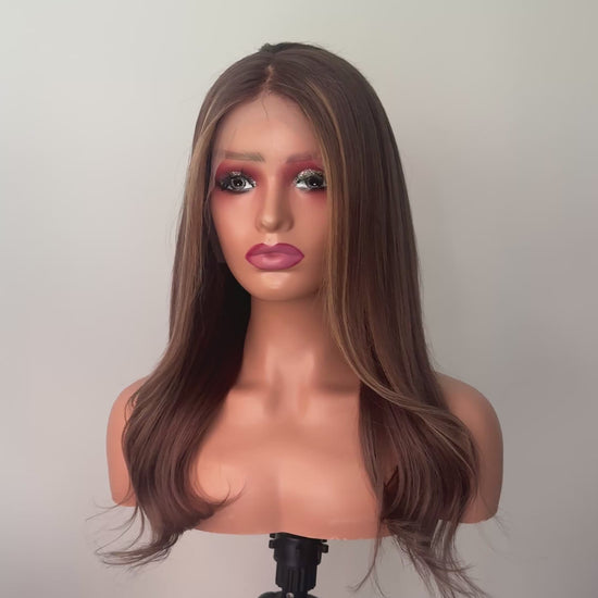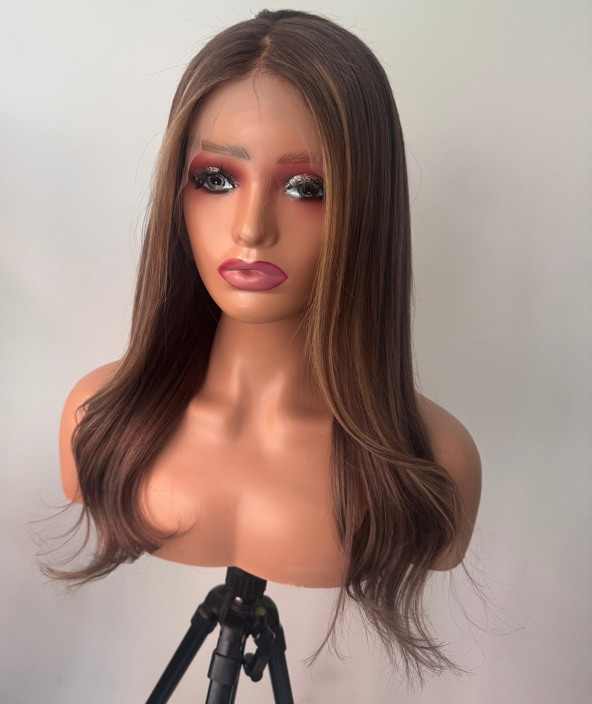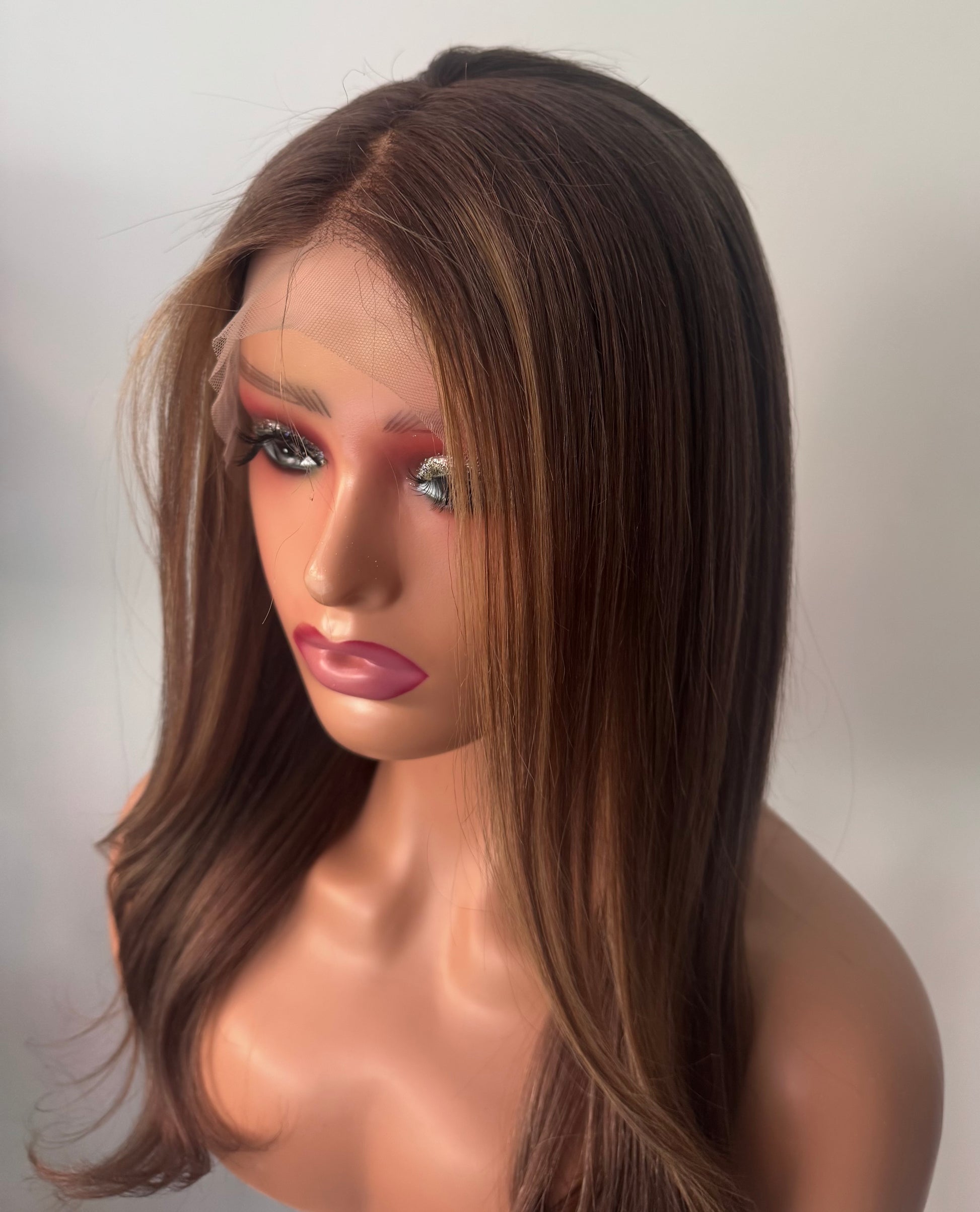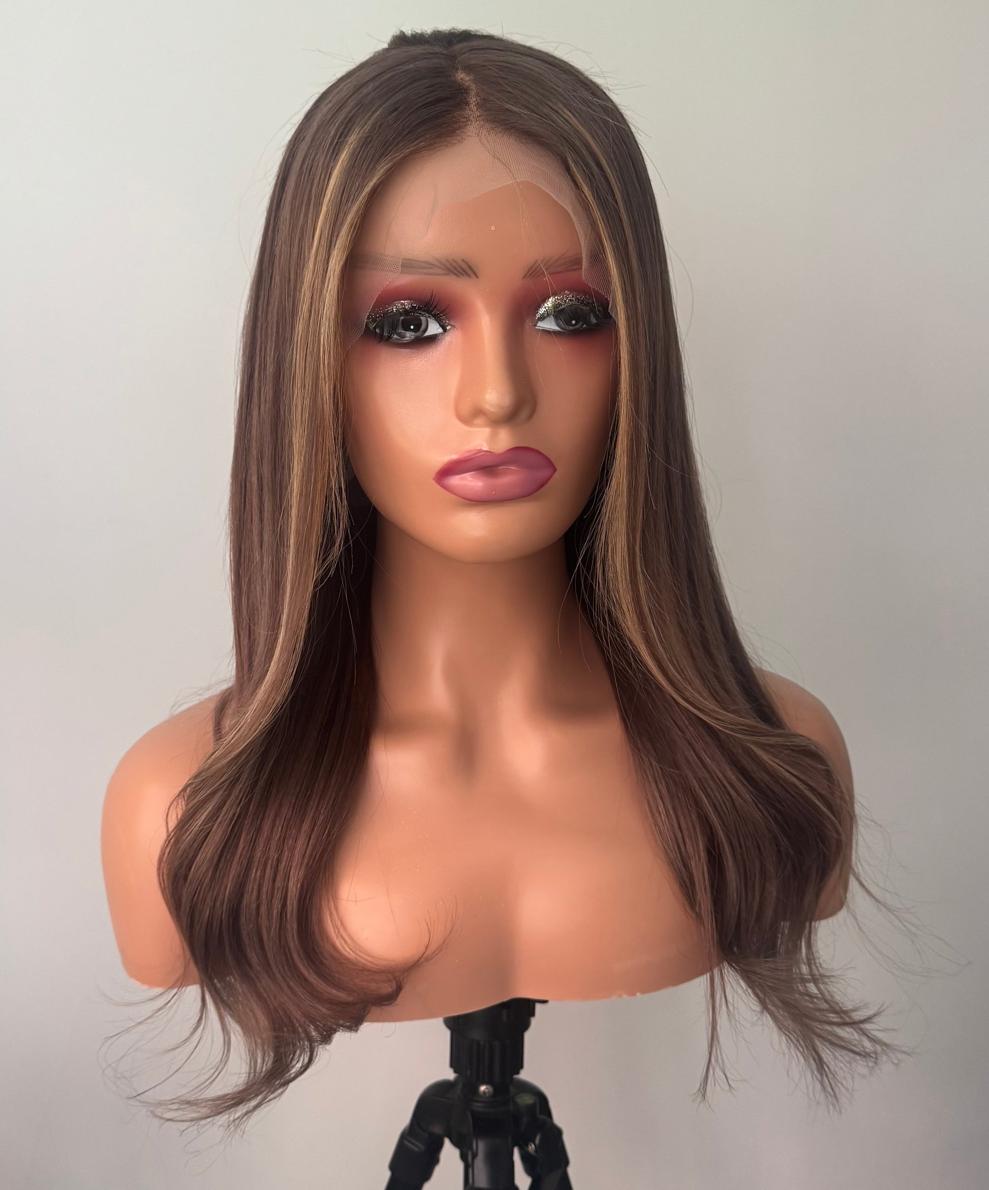 Elevate your style with our Rich Brown & Honey Blonde blend wig, featuring a striking front money piece for added brightness and dimension. This unit combines warm, natural tones with modern detailing for a fresh, on-trend look.